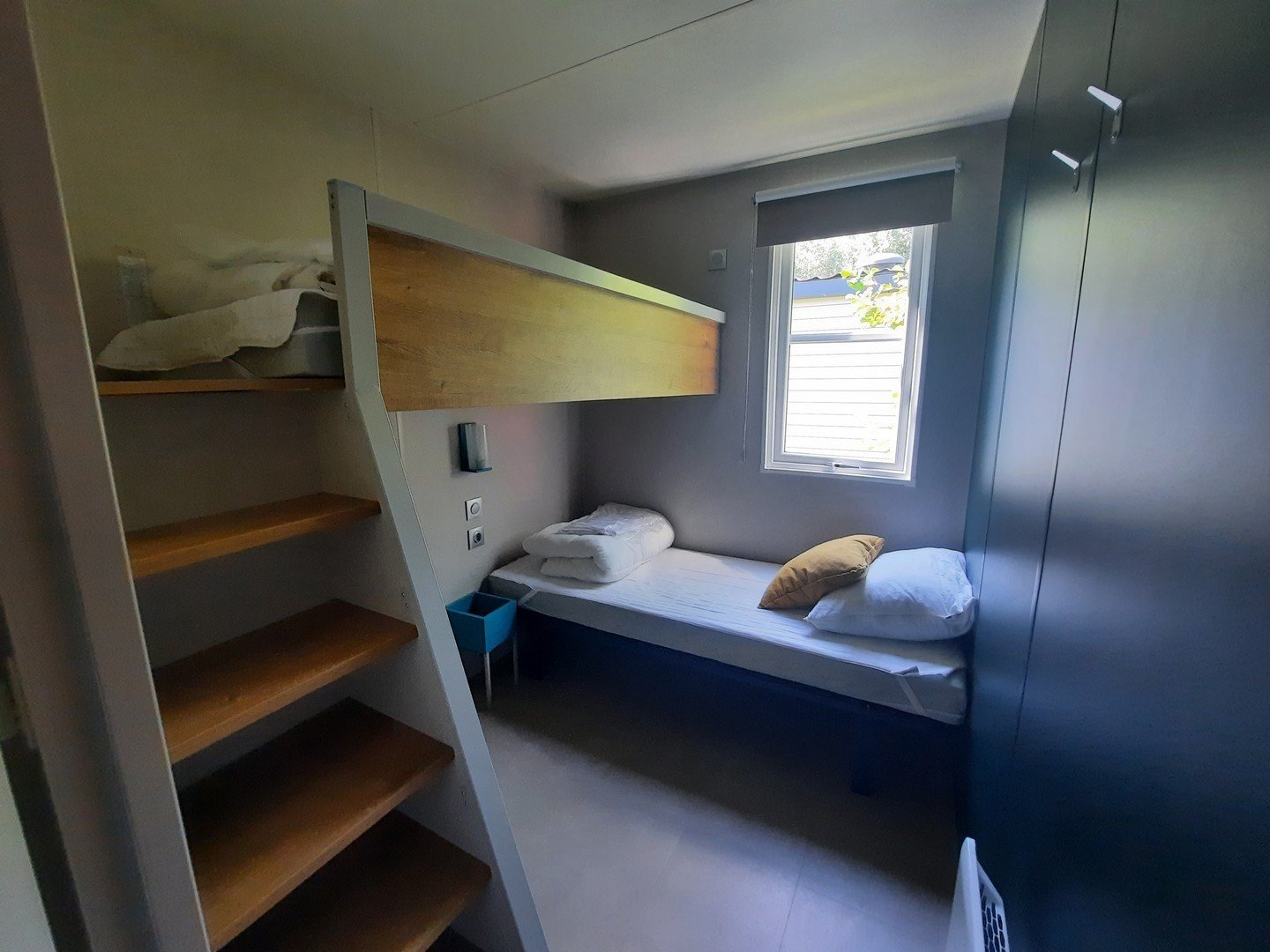 - Three bedrooms: one with a double bed, one with two single beds, one with bunk beds. Each bedroom has a wardrobe.