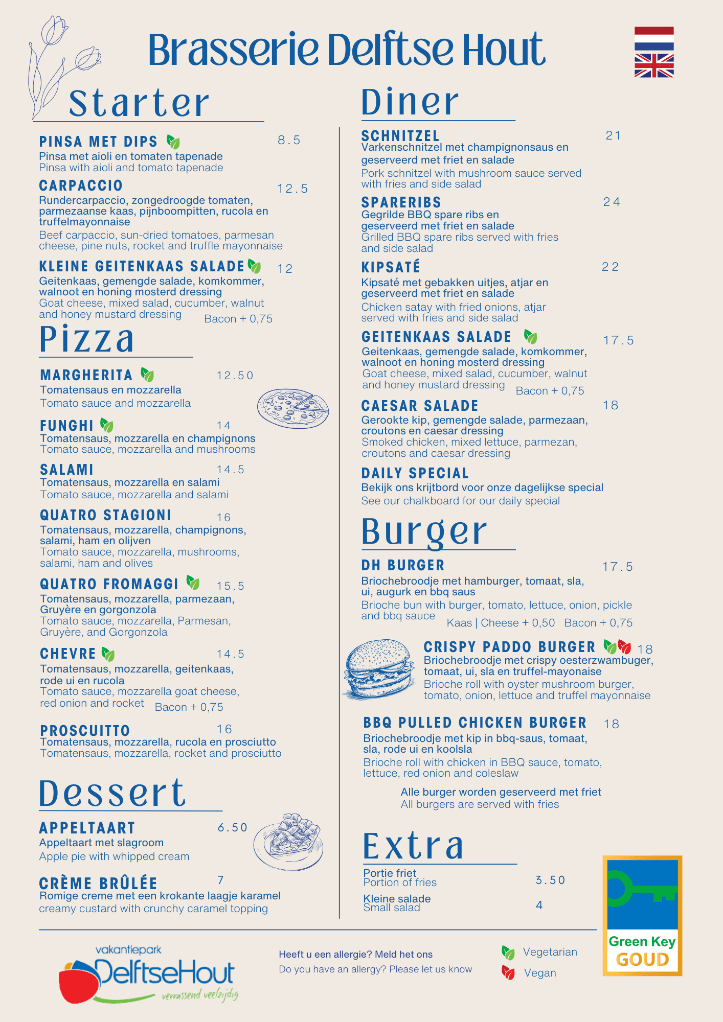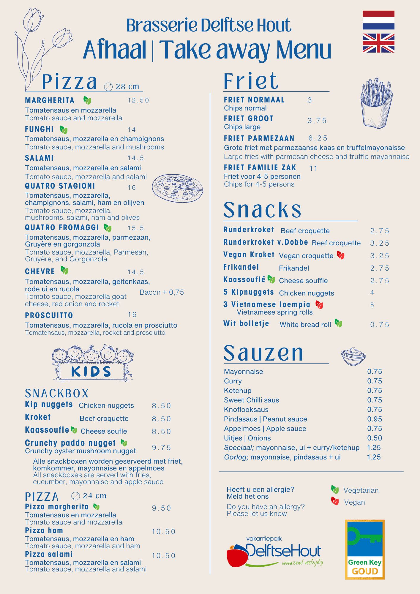 Come visit our cosy brasserie and enjoy a fresh pizza, tasty snacks with chips or another favourite dish. Take a seat on the terrace to enjoy the beautiful weather, or take your order with you to your own camping pitch or accommodation. Whatever you prefer!